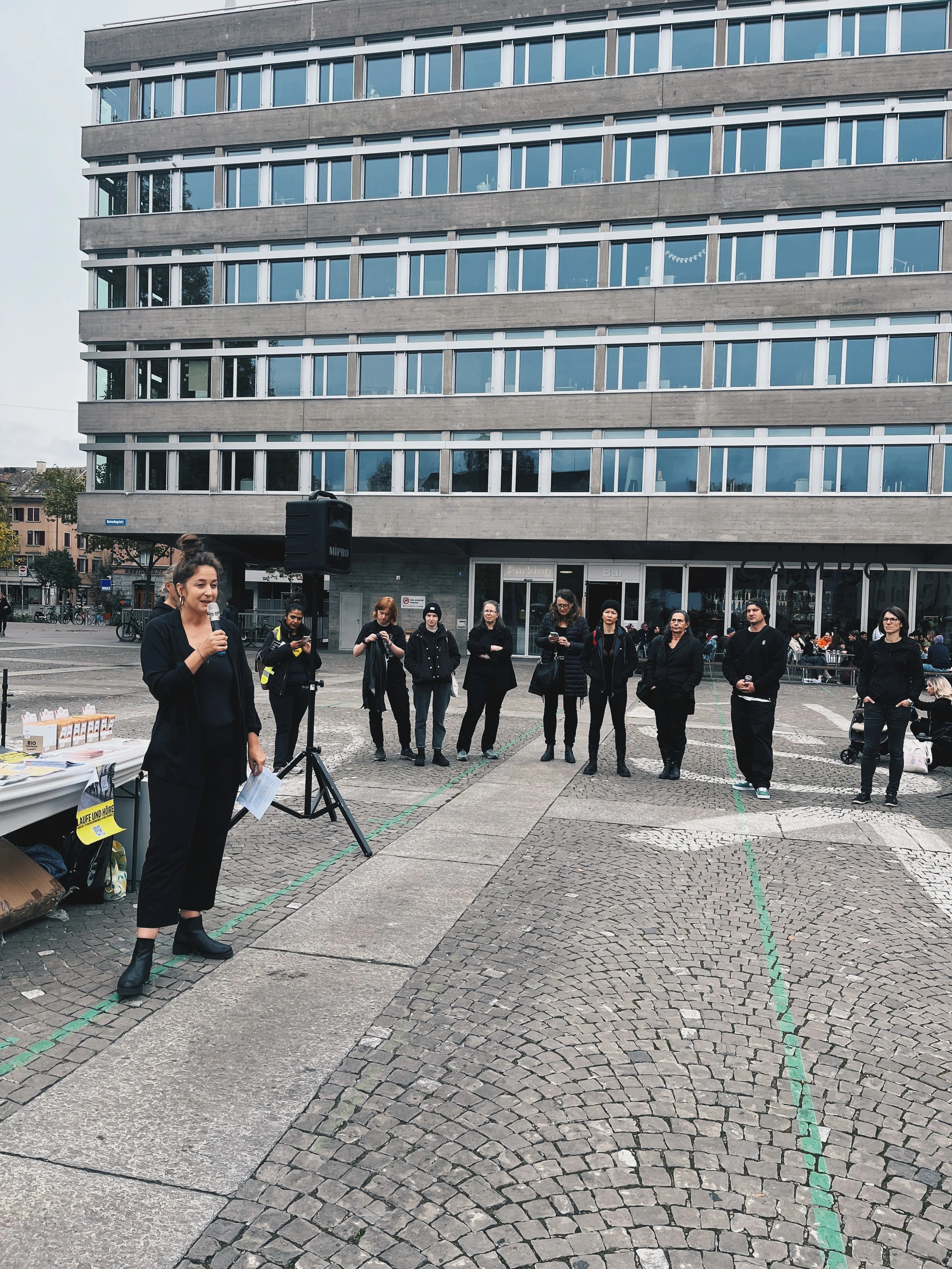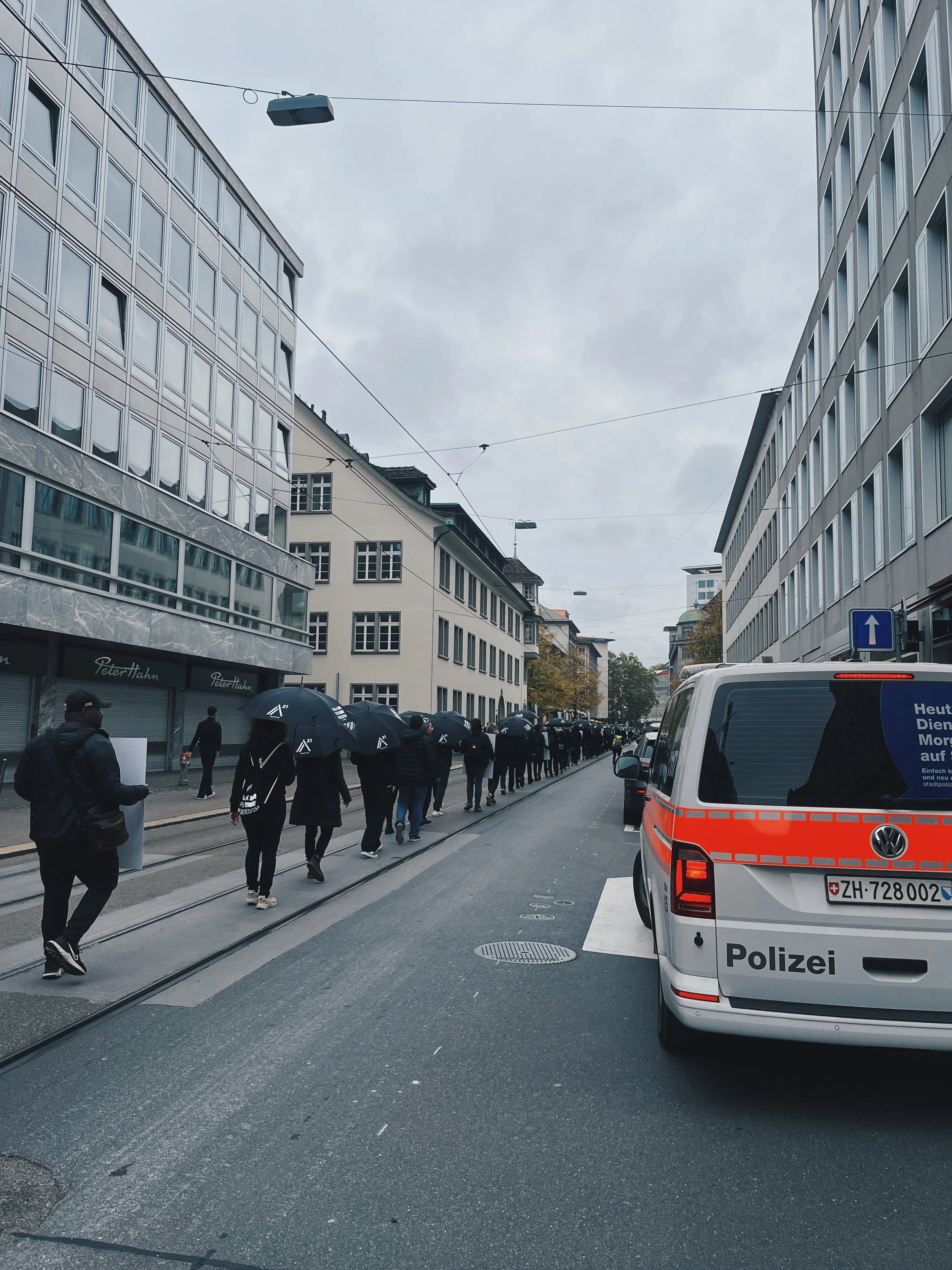 Dann geht’s los. In einer Einerkolonne mit 1,5 meter Abstand wird marschiert, manche tragen Plakate, einige einen Regenschirm, viele haben den Mund zugeklebt. Vom Helvetiaplatz geht es am Stauffacher vorbei und dann die Bahnhofstrasse rauf. Man hat mir eine gelbe Weste gegeben. Damit fühle ich mich ganz offiziell. Es gibt Polizeiautos, die uns eskortieren. Ich bemühe mich, etwa in der Mitte der Kolonne zu bleiben und jedem einen Flyer zu verteilen, der noch keinen hat und der einen möchte. Ab und zu gibt es kurze Gespräche, eine ältere Italienerin schüttet mir gleich ihr Herz aus. Danach muss ich rennen, um die Kolonne wieder einzuholen. Ich schwitze in meinem Thermoshirt mit Blazer. Einer meint, dass er nächstes Mal auch dabei sein möchte, ein anderer findet es super, dass es mal eine stille Demonstration gibt, eine bei der nicht gebrüllt wird. Viele bleiben staunend stehen ob dem ungewöhnlichen Bild, das sich ihnen bietet. Mit fragendem Blick nehmen sie dankend einen Infoflyer entgegen. Einige meinen was für ein wichtiges Thema und nicken.